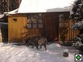 | Borka nás přivítala ve sněhu. | Promrzlá Borka. | Promrzlá Borka. | Baxamil hledá něco k snědku. |